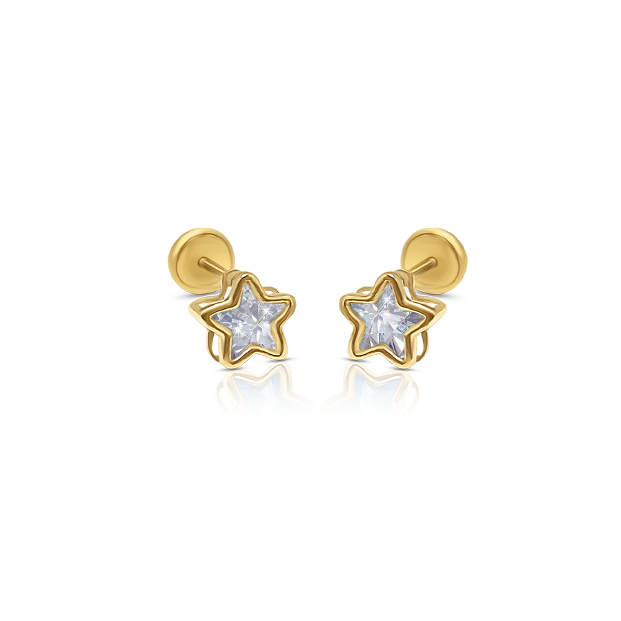 Descubre este par de aros con forma de Estrella que reflejan la esencia de la elegancia atemporal fabricados con oro 18 Kilates y circón. La simplicidad se encuentra con la sofisticación en este diseño que destaca por su pureza y brillo natural.