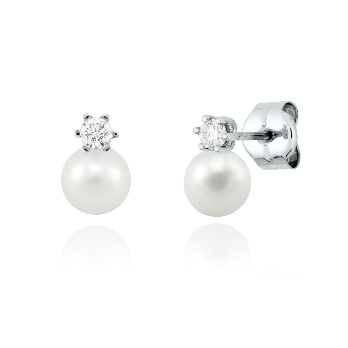 Par de aros Oro Blanco Perla 5mm Diamante 0,10 ct