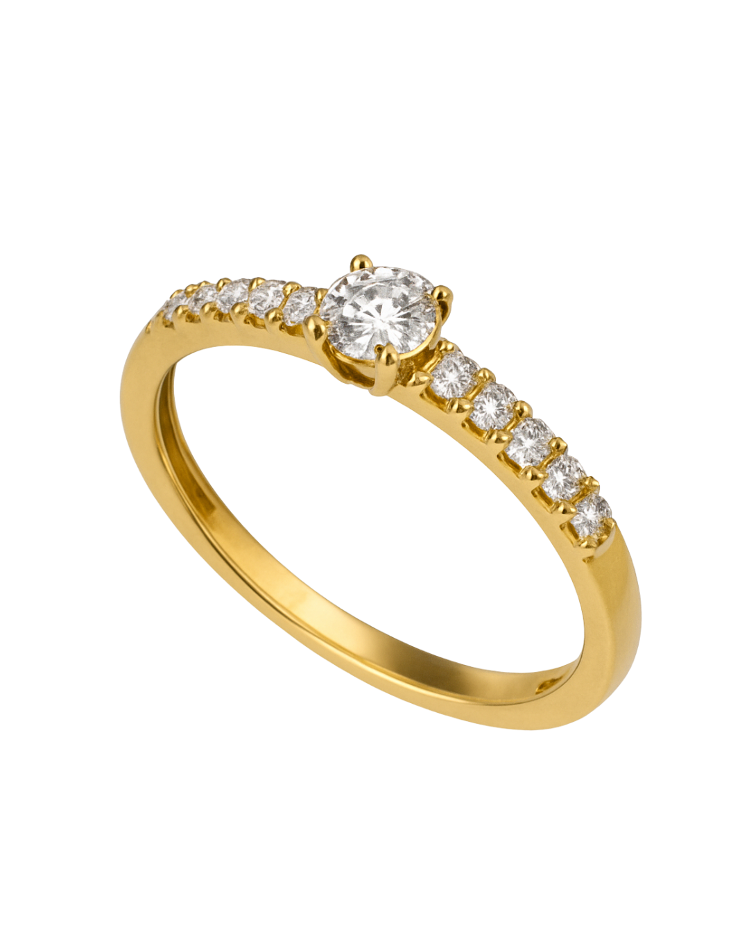 Un diseño delicado y sofisticado que resalta por su brillo y elegancia. Este anillo de oro amarillo 18 kilates luce un circon central talla brillante que capta la luz con intensidad, acompañado por diez circones laterales engastados en pavé que aportan un destello sutil y refinado.