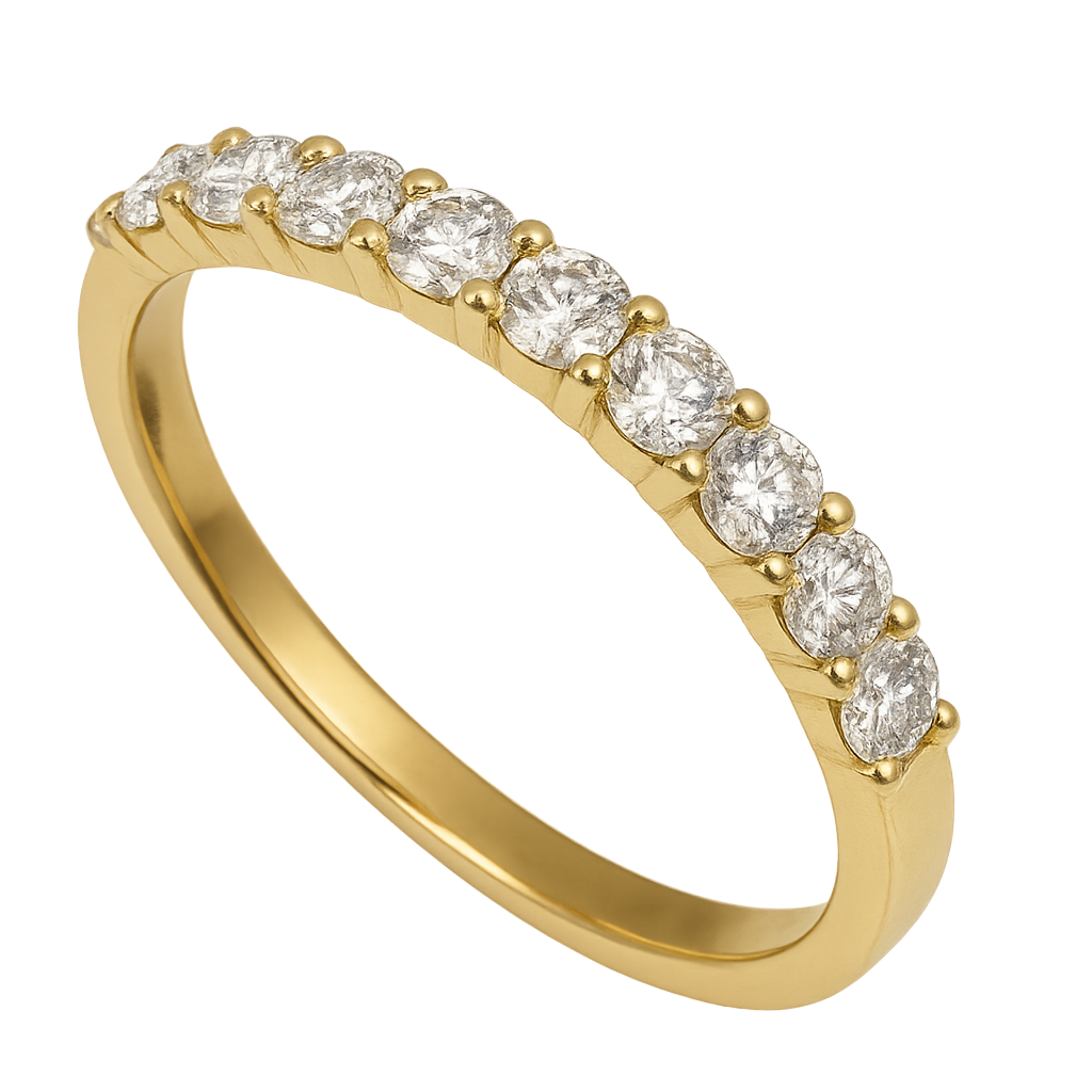 Un diseño moderno y sofisticado que destaca por su contraste único. Elaborado en oro amarillo 18 kilates, este anillo presenta un medio cintillo de circones en el centro, que aportan luz y equilibrio al diseño.