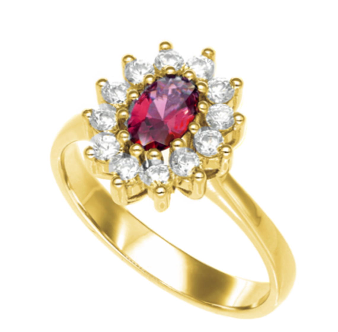 Un diseño clásico y sofisticado que destaca por su elegancia atemporal. Este anillo de oro amarillo 18 kilates cuenta con un Rubí central corte ovalado que aporta un toque de color vibrante, rodeada por circones transparentes engastados con precisión, formando un delicado halo que potencia su brillo y armonía.